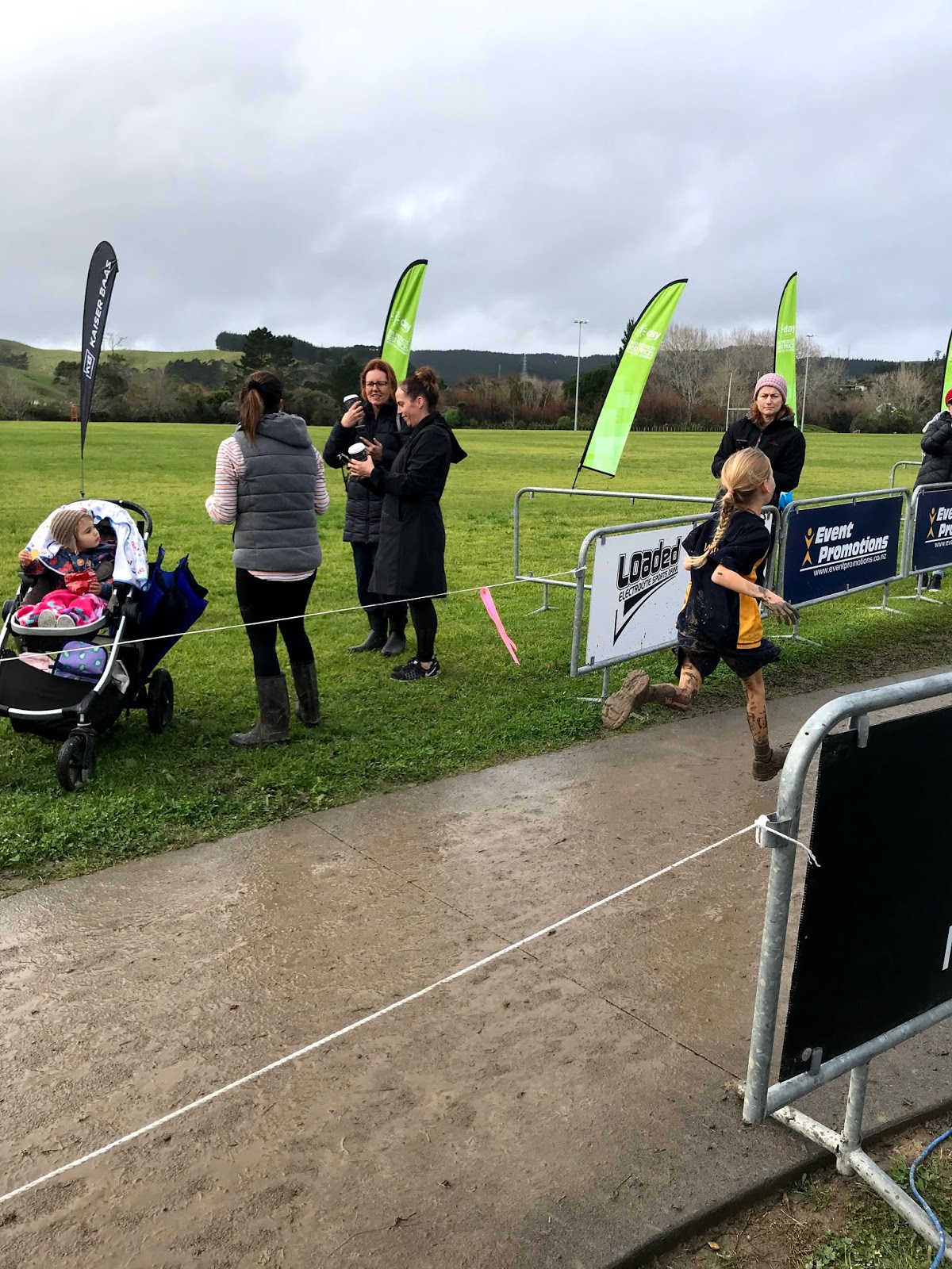 We all had to tape our shoes to our feet with electrical or duct tape so they didn't get stuck in the mud. At eight o'clock in the morning, we gathered near the sandpit, and put our bags on a waterproof sheet. Ms Sands (my class teacher and running coach) called out the roll, and sorted us into some cars to get to the Helensville Point. I was with Abigail, and her parents. When we finally arrived at our destination, we pinned number markings onto our t-shirts. After that we had around thirty minutes of running around before we had to get to the event van for the briefing. In those thirty minutes I ran up and down the ramps with Abigail. It was drizzling slightly, but that was no matter.